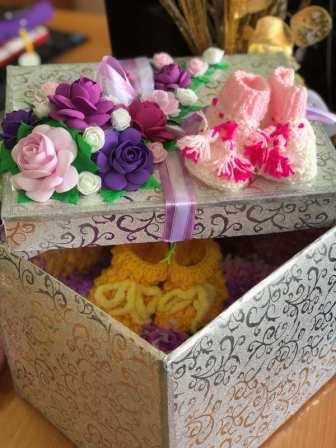 В результате проведения акции были связаны мягкие, удобные пинетки из красивой пряжи. Ну а какой же подарок без упаковки? Конечно же была изготовлена красивая подарочная коробочка.