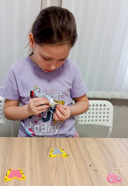 брошь в виде сердца для своих мам, а себя порадовали заколками для волос. Для изготовления украшений понадобились листы фоамирана, различные бусины, клей и крепления. Каждый ребёнок самостоятельно украсил свои изделия, получилось очень ярко и красиво.