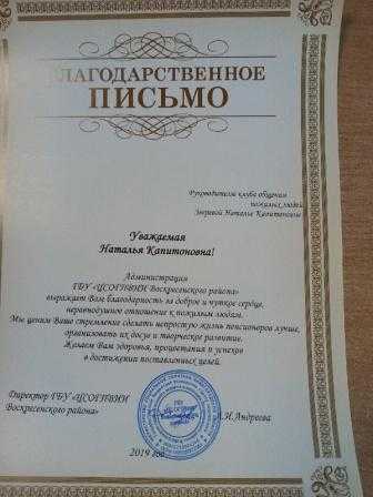 Руководители клубов, которые были созданы на базе ГБУ ЦСОГПВИИ Воскресенского района "Селяночка" Зверева Н. К., "Китежане" Покалякина В. И., "Затея" Новожилова Т. В., созданные на базе ГБУ ЦСОГПВИИ Воскресенского района, из года в год награждаются благодарностями за активную работу и организацию досуга пожилых людей!